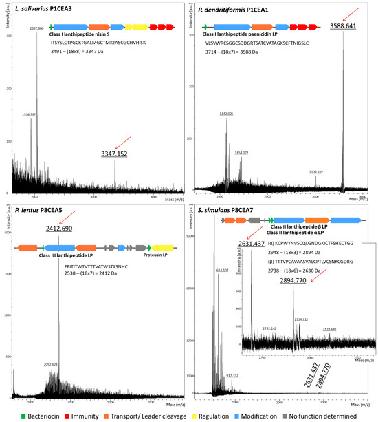 Colony MALDI-TOF MS analysis of samples from L. salivarius P1CEA3, P. dendritiformis P1CEA1, P. lentus P8CEA5, and S. simulans P8CEA5, which encode different class I, II, and III lanthipeptide bacteriocins. The BGC and amino acid sequences of the lanthipeptides are represented. ORFs are represented by arrows and those with a predicted function are indicated by gene identity and/or color.