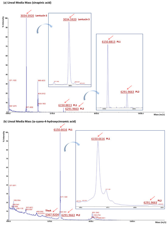 MALDI-TOF MS analysis of the RP-FPLC active fractions from the purified supernatants of P. lentus P8CEA5. (a). Sinapinic acid matrix, and (b). α-cyano-4-hydroxycinnamic acid matrix. Peptide peaks with the molecular masses as observed for the predicted lentucin S (thuricin 17 family bacteriocin), thermophilin A LP (TheA) and the circular bacteriocins PL1 and PL2.