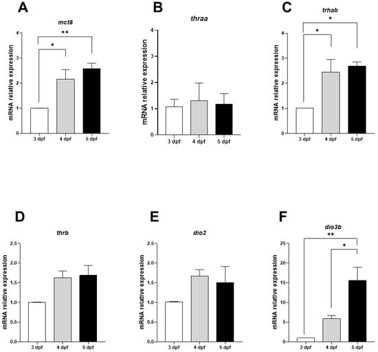 mct8 showed a significant increment from 3 to 4 dpf, thrab and thrb showed an increase from 3 to 4 dpf and remained constant at 5 dpf, and thraa did not show significant changes (Figure 1A–D). Regarding the deiodinase enzymes, dio3b showed the most dramatic changes (Figure 1F), increasing by 5- to 15-fold at 4 and 5 dpf compared to 3 dpf, respectively. On the other hand, dio2 increased from 3 to 4 dpf, but this difference was not statistically different (Figure 1E). These results demonstrated the positive regulation of the thyroid signaling elements during early retinal development.