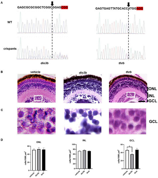 Comparison of dio3b and thrb crispants at retinal level. (A) Electropherograms from a fragment of the PCR amplicon sequence for dio3b and thrb of the vehicle-microinjected controls and the corresponding crispants. At the top, the sgRNA sequence is denoted, and the PAM sequence is highlighted in red. In the crispants, a decrease in the resolution of the electropherogram is evident around the canonical cutting site indicated with an arrow and a dotted line. (B) Representative histological cross-sections of retinas of vehicle-injected controls and thrb and dio3 crispants (5–7 retinas per condition) stained with H&E. (C) Amplification of the GCL (insets in (B)). (D) Quantification of the number of cells/1000 µm2. ONL = outer nuclear layer, INL = inner nuclear layer, GCL = ganglion cell layer. Statistical analyses were performed using one-way ANOVA and Tukey post hoc tests. * = p < 0.05. Scale bar = 20 µm.