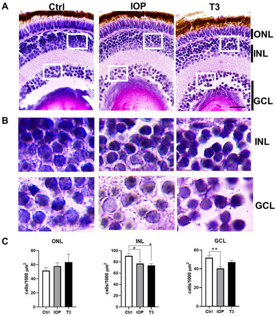 Thyroid status modifies the number of cells in the GCL and INL. (A) Representative histological retina cross-sections of control, IOP-treated, or T3-treated zebrafish larvae at 5 dpf stained with H&E. (B) Amplification of the INL and GCL (insets in (A)). (C) Quantification of the number of cells/1000 µm2 (n = 6) from the different experimental groups. Bars represent the mean ± SEM. Statistical analyses were performed using one-way ANOVA and Tukey post hoc tests. * = p < 0.05, ** = p < 0.01. ONL = outer nuclear layer, INL = inner nuclear layer, GCL = ganglion cell layer. Scale bar = 20 µm.