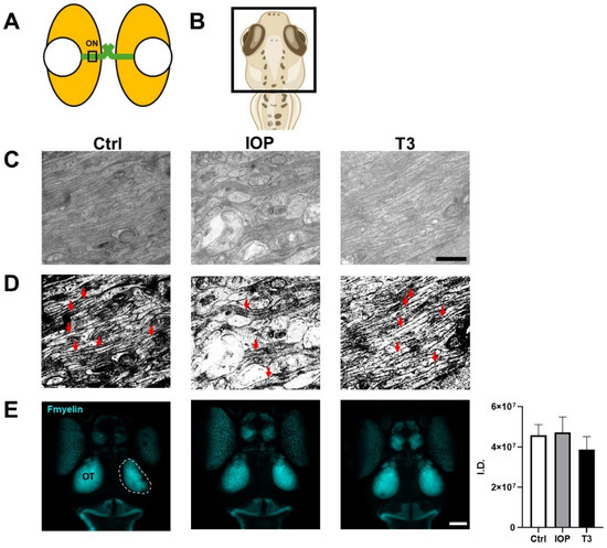 In vertebrates, the cells of the GCL are those that form the optic nerve [27,31]. To show that the number of cells in the GCL is also reflected at the level of the optic nerve, we analyzed this structure using transmission electron microscopy in the different experimental groups. While the control animals and those treated with T3 showed a similar pattern of axons in the optic nerve, the animals treated with IOP showed a lower number of axons (Figure 4A), which correlates with the lower number of cells observed in the GCL under this treatment. In teleost fish, the first structure to receive information from the optic nerve is the optic tectum [32,33]. With the aim of analyzing whether our treatments could also be affecting the development of structures involved in visual processing, we analyzed the staining of myelin (Fmyelin) in the optic tectum in a whole mount preparation of control larvae and larvae treated with IOP or T3. In general, we did not find differences in the morphology and structure of the optic tectum (Figure 4B), which suggests that IOP and T3 treatments directly affect the retinal cells and the optic nerve but not the visual centers in the SNC.
