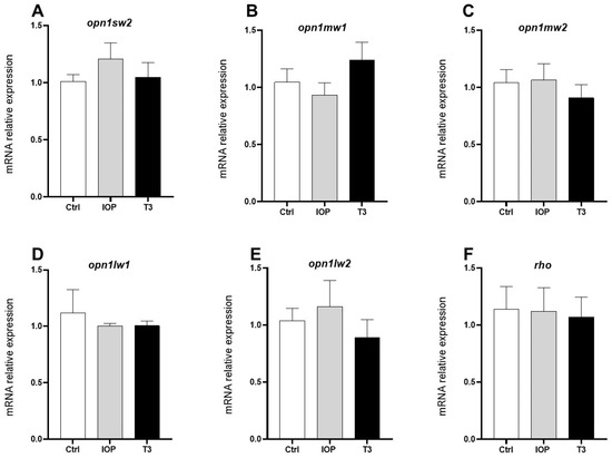 One of the well-established TH effects is their regulation of the expression of the opsin 1 long wave sensitive (OPN1LW) gene, which detects the color red in humans, and the zebrafish homologue Opn1lw, which is duplicated in this species (Opn1lw1 and Opn1lw2) [12,13,15,34]. To verify if, in our paradigm, the expression of these opsins was regulated, we dissected the eyes of the IOP-treated and T3-treated 5 dpf zebrafish larvae and analyzed opsin expression by RT-PCR. Our results showed that, at that stage, neither treatment modified the expression of opn1lw1 or opn1lw2 (Figure 5D,E). Other opsin genes (opn1sw2, opn1mw1, opn1mw2, and rho) also did not change their expression when compared to the control group (Figure 5A–C,F).