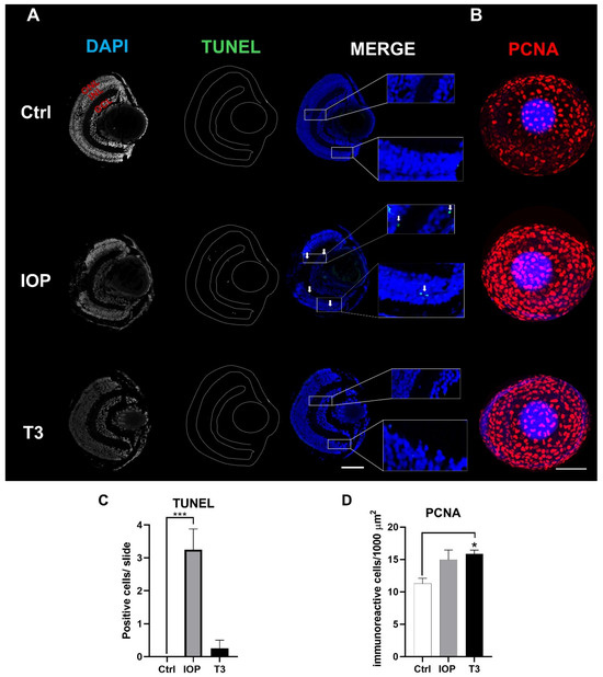 Retinal cell proliferation (PCNA) increased after IOP and T3 treatments, although statistical significance was only found with the latter. Given that retinal cell number decreased with both treatments, cell proliferation could be triggered as a regenerative mechanism. Muller glia cells have been shown to regenerate lost cells after damage [49,50,51]. Immune cells, such as microglial cells, may also invade the retina and proliferate as a response to retinal degeneration [52]. Another explanation could be that the treatments delayed the developmental cell proliferation programs, which naturally decrease as retinal cells differentiate [53,54]. Although the molecular mechanisms are still unclear, an imbalance in T3 homeostasis results in the alteration of retinal cell proliferation.
