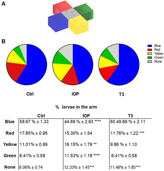 IOP and T3 modify the color preference paradigm. (A) Cross color maze and preference tests used in this study based on Park et al., 2016 [28]. (B) Color preference paradigm showing that IOP and T3 modify the pattern of color preference when compared to the control (ctrl) group (n ≥ 7 independent assays). Data are the mean ± SEM. ** = p < 0.01, *** = p < 0.001, **** = p < 0.0001.