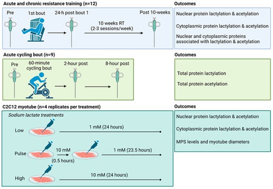 Therefore, one aim of this study was to determine if one bout or chronic resistance training and/or one bout of endurance exercise affected various markers of skeletal muscle protein acetylation and lactylation in humans. Moreover, we sought to determine how either pulse or 24 h sodium lactate treatments affected similar outcomes in C2C12 myotubes (See Figure 1). Due to our previous null findings, we hypothesized that markers associated with protein lactylation would either remain unaltered or decrease in response to different exercise paradigms. Moreover, in line with prior literature, we hypothesized that markers associated with protein acetylation would be dynamically altered. Lastly, we hypothesized that lactate administration would not alter markers associated with protein lactylation in vitro.
