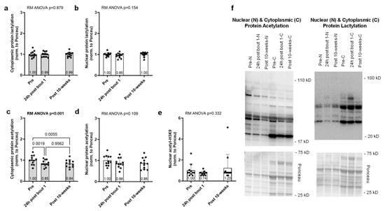 Effects of acute and chronic resistance training on nuclear and cytoplasmic protein lactylation and acetylation. Biopsies were obtained prior to the intervention (pre), 24 h following the first exercise bout (24 h post-bout 1), and following the 10-week intervention (post-10 weeks) in 12 participants. No significant alterations occurred with cytoplasmic protein lactylation (a), nuclear protein lactylation (b), nuclear protein acetylation (d), or nuclear H3K9 acetylation (e). However, cytoplasmic protein acetylation (c) was significantly reduced with one bout of resistance exercise and chronic training. Representative Western blots for the protein targets (f) are presented. Bar graphs are mean and standard deviation values, with individual respondent data overlaid.
