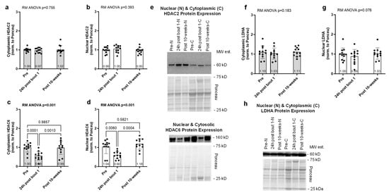 The results for the effects of acute and chronic resistance training on select enzymes involved with protein acetylation (HDAC2/6) and lactylation (LDHA) are presented in Figure 3. Cytoplasmic and nuclear HDAC2 protein expression showed no significant model effects (p = 0.755 and p = 0.393, respectively, Figure 3a,b). However, cytoplasmic and nuclear HDAC6 protein expression exhibited significant model effects (p < 0.001 for each, Figure 3c,d), and this marker was reduced in both tissue fractions 24 h following bout 1. Cytoplasmic and nuclear LDHA protein expression showed no significant model effects (p = 0.183 and p = 0.076, Figure 3f,g).