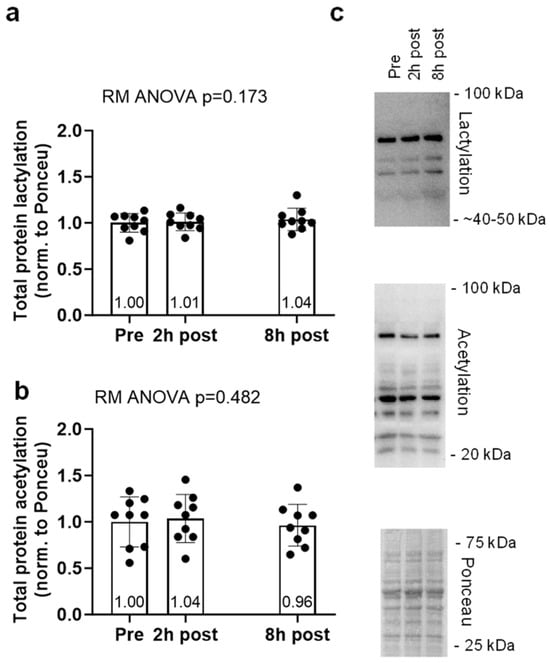 Global protein lactylation and acetylation data for the acute cycling bout can be found in Figure 4. Global protein lactylation and global protein acetylation showed no significant model effects (p = 0.173 and p = 0.482, respectively, Figure 4a,b).