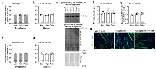C2C12 cell culture experiment data can be found in Figure 5. Cytoplasmic and nuclear protein lactylation levels were not significantly different between treatments (ANOVA p = 0.714 and p = 0.123, respectively, Figure 5a,b). Cytoplasmic and nuclear protein acetylation levels were also not significantly different between treatments (ANOVA p = 0.540 and p = 0.732, respectively, Figure 5c,d). Myotube diameters were not significantly different between treatments (ANOVA p = 0.566, Figure 5f), and this is supported by cytoplasmic puromycin-labeled proteins (i.e., muscle protein synthesis levels) not being different between treatments (p = 0.180, Figure 5g).
