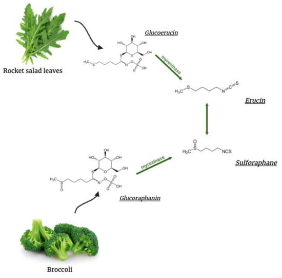 - Clarke, J.D.; Hsu, A.; Riedl, K.; Bella, D.; Schwartz, S.J.; Stevens, J.F.; Ho, E. Bioavailability and inter-conversion of sulforaphane and erucin in human subjects consuming broccoli sprouts or broccoli supplement in a cross-over study design. Pharmacol. Res. 2011, 64, 456–463. [Google Scholar] [CrossRef] [PubMed]