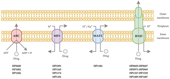 As the literature review of studies shows, only four superfamilies of efflux pumps have been identified so far in H. pylori: RND, MFS, ABC, and MATE [33,34] (Figure 1). Their detailed characteristics and description of known functions are presented below.