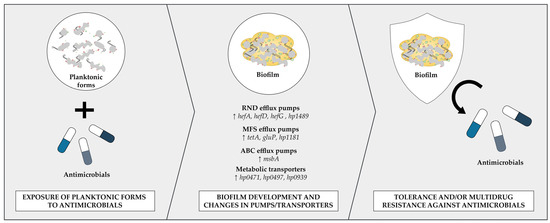 A schematic drawing showing a response of H. pylori to the antimicrobial exposure. This adaptative response is associated with changes in the expression profile of genes encoding efflux pumps and metabolic transporters during the planktonic-to-biofilm transition of Helicobacter pylori, which as a result lead to tolerance and/or multidrug resistance against antimicrobials.