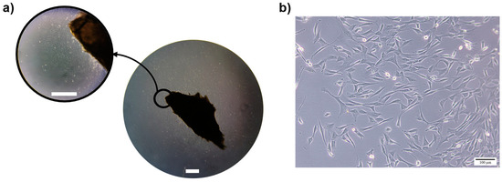 Periodontal ligament (PDL)-derived cells were obtained by the explant culture method [28]. Cells’ outgrowth was visualised after 7–12 days of incubation (Figure 1a), and, following, cells presented a high growth rate. Under light microscopy, PDL-derived cells presented plastic adherence and a spindle/fibroblastic-shaped morphology (Figure 1b). Cell subculturing to expand the number of cells was performed until passage 3, being always accomplished at ~80% confluent to guarantee an exponential growth phase. At this stage, cells kept a high proliferative potential and an elongated morphology.