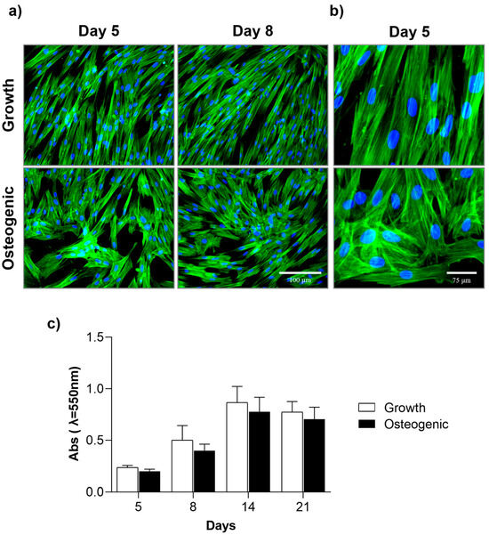 Immunocytochemical staining of F-actin cytoskeleton (green) and nucleus (blue) of uninduced (growth medium) and osteogenic-induced PDL-derived cell cultures on days 5 and 8; Bar = 100 µm (a) and 75 µm (b). (c) Metabolic Activity (MTT assay) of uninduced (growth medium) and osteogenic-induced cell cultures on days 5, 8, 14, and 21.