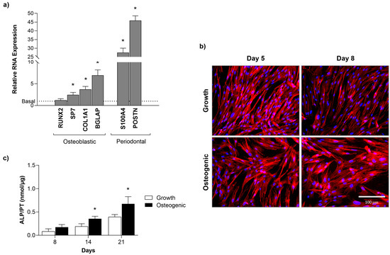 Gene expression by PDL cells growing in both culture conditions was evaluated at day 8 (Figure 3a), a phase of exponential cell growth as suggested by the results observed in the MTT assay. In this culture stage, cells cultured in a growth medium were able to express osteoblastic genes, i.e., RUNX2, SP7 (coding for osterix), Collagen a1 (coding for collagen type 1), BGLAP (coding for osteocalcin), and the periodontal-related genes S100A4 and POSTN. In osteogenic-induced conditions, the expression of RUNX2 was not affected, but there was a significant increase in the expression of all other genes. The highest induction was observed for the expression of BGLAP and the periodontal genes S100A4 and POSTN.