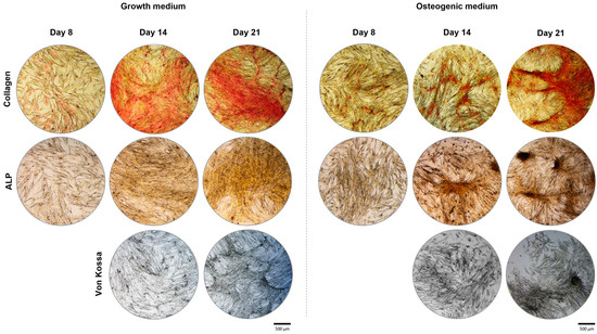 ALP staining: Fixed cultures (days 8, 14, and 21) were incubated in a filtered solution containing sodium naphthyl phosphate (2 mg/mL, Sigma-Aldrich, St. Louis, MO, USA) and Fast Blue RR in Tris buffer solution 0.1 M, pH 10 (2 mg/mL, Sigma-Aldrich, St. Louis, MO, USA) for 1 h protected from light and further observed for the characteristic brown-to-black staining.