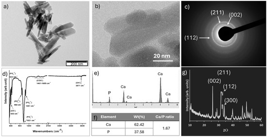 Transmission electron microscopy (TEM) (a,b) of developed Hap NPs with the corresponding electron diffraction pattern (SAED) (c); ATR-FTIR analysis (d) and chemical elemental composition determined by energy dispersive X-ray spectroscopy (EDX) (e) and inductively coupled plasma (ICP) (f); X-ray diffraction (XRD) diffractograms (g).
