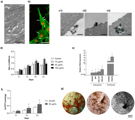 Behaviour of PDL-derived cell cultures exposed to hydroxyapatite nanoparticles for periods of up to 21 days. SEM image ((a), day 8, Bar = 30 μm), fluorescence image for F-actin (green) and nucleus (red) ((b), day 8, Bar = 75 µm), TEM images (c) showing the interaction of the cell surface with the Hap NPs ((c1,c2), Bar = 1 μm) and the NPs internalised and located in a large vacuole ((c3), Bar = 2 μm). Metabolic activity ((d), up to 21 days) of uninduced cultures (growth medium) and cultures exposed to hydroxyapatite nanoparticles. Phenotype differentiation, as assessed by the gene expression ((e), day 8), ALP activity ((f), up to 21 days), and histochemical staining of the cultures ((g), 21 days, Bar = 500 µm). * Significantly different from the cultures kept in growth medium (absence of Hap NPs).