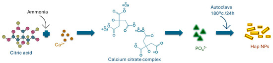 Hap NPs were produced through a one-step hydrothermal process. The synthesis followed a methodology outlined in our prior research [50,51,52]. To summarise, an aqueous solution (0.6 M) of citric acid monohydrate (C6H8O7·H2O, 99.5%, Riedel-de-Haën), was prepared with a pH of 8.1 adjusted by adding 25% v/v ammonia (NH4OH, Riedel-de-Haën). Subsequently, calcium nitrate tetrahydrate (0.2 M), [Ca(NO3)2·4H2O, 99%, Riedel-de-Haën] was added to the citrate solution. Following this, a 0.2 M solution of (NH4)2HPO4 (Sigma-Aldrich, St. Louis, MO, USA) was slowly added dropwise while stirring. The resulting homogeneous solution was then transferred into a 50 mL Teflon-lined stainless-steel autoclave and maintained at 180 °C for 24 h. Finally, the precipitate was collected by filtration using a 0.22 μm Millipore filter and washed with Millipore water. Figure 7 presents a schematic illustration of the synthesis of Hap NPs using citrate and the hydrothermal method.