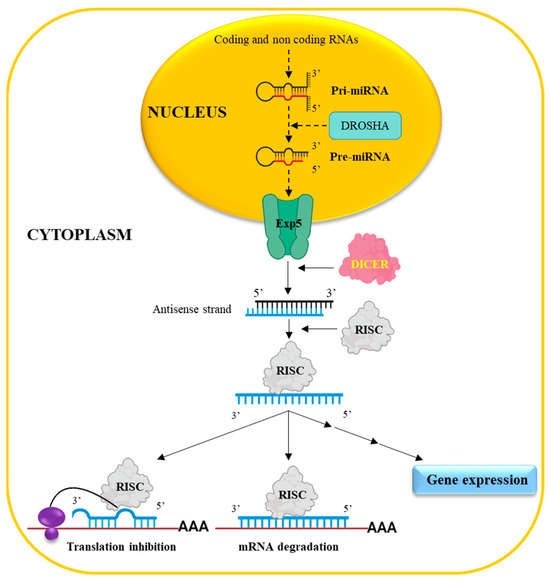 - Lee, Y.; Jeon, K.; Lee, J.T.; Kim, S.; Kim, V.N. MicroRNA maturation: Stepwise processing and subcellular localization. EMBO J. 2002, 21, 4663–4670. [Google Scholar] [CrossRef]