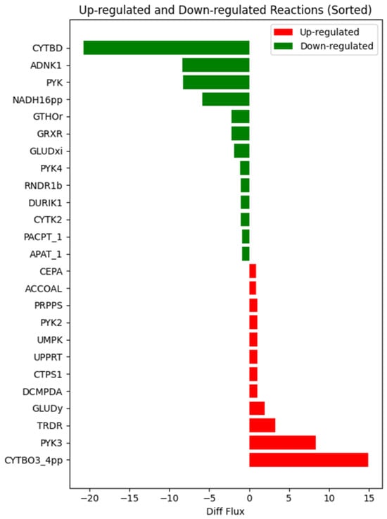 To explore the potential mechanism of action of bismerthiazol against Xoo, RNA-seq data of Xoo treated with or without bismerthiazol were integrated into Xoo-GSSM and analyzed using the iMAT algorithm. The pFBA method was used to calculate the reaction flux and the flux differences between the two groups. Out of the 2155 reactions in the Xoo-GSMM, 1466 reactions corresponded to genes in the RNA-seq data. Among these 1466 reactions, the metabolic flux of 286 reactions changed in Xoo treated with bismerthiazol. Of these, 97 reactions exhibited increased metabolic flux, while 189 reactions displayed decreased flux. After removing transport reactions, non-target reactions, and loop reactions, the top 25 reactions with the largest changes in metabolic flux (including 12 upregulated and 13 downregulated reactions) were selected for further analysis. The names and differential metabolic flux data of these 25 reactions are shown in Figure 1. Their metabolic flux, corresponding genes, functions, and metabolic pathways are summarized in Tables S1 and S2.