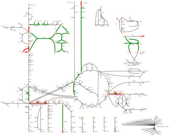 To display the metabolic flux change in each reaction intuitively, a web-based tool Escher was used to visualize the core data of reactions in the Xoo-GSMM. The reactions with the increased metabolic flux are indicated with red lines and those with the decreased metabolic flux are denoted with green lines (Figure 2).
