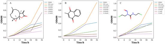 The turbidimetric growth curve of Xoo at different concentrations of PTL (A), menadione (B), and carmustine (C).