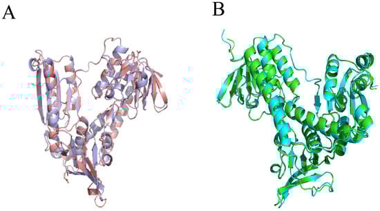 AlphaFold [], developed by DeepMind, has significantly advanced the field of protein structure prediction through deep learning techniques. In this study, we utilized AlphaFold to predict the structure of the target protein and compared it with the previously predicted structure obtained from SWISS-MODEL. Figure 4B shows the comparison between the two structures. As expected, the structure predicted by AlphaFold aligned well with the model generated by SWISS-MODEL, demonstrating a high degree of structural overlap, which further confirms the reliability of the model. These results indicated that the obtained Xoo-GSR model was sufficiently reliable to be used for subsequent molecular docking analysis.