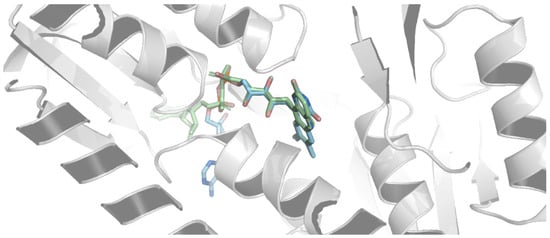 Molecular docking was performed using AutoDock Vina [] to screen more lead compounds for the Xoo-GSR target. The Xoo-GSR model was pretreated with MGLTools by adding hydrogen, assigning atom types, and calculating charges. A redocking experiment was performed with the ligand flavin adenine dinucleotide (FAD) from 1GER as a test molecule to ensure that the docking algorithm could produce the observable binding mode. The initial geometric parameters of FAD were extracted from the 1GER crystal structure. FAD was added with hydrogen atoms and energy-minimized using the Tripos force field []. As shown in Figure 5, the binding mode of FAD to the Xoo-GSR target obtained by AutoDock Vina was almost identical to that of the 1GER crystal complex, indicating that our molecular docking was feasible for subsequent Xoo-GSR structure-based virtual screening.