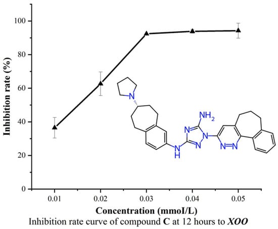 The bacterium-inhibition curves showed that with increasing compound concentration, the inhibitory rate increased (Figure 6). When the concentration reached 0.03 mM, the inhibitory rate of DB12411 against Xoo reached about 92.0% and became steady. The MIC of DB12411 against Xoo was 0.032 mM. As a comparison, the commercial agent bismerthiazol has been reported in multiple studies to have an MIC range of 0.14 mM to 0.65 mM against Xoo [,]. In contrast, DB12411 exhibits a significantly lower MIC than bismerthiazol, indicating stronger antibacterial potential. DB12411, also known as bemcentinib, has been used for treating non-small cell lung cancer, breast cancer, and COVID-19. To date, no report on its antibacterial effect is available. The above experimental results demonstrated that DB12411 could inhibit the growth of Xoo, thus making it a potential lead compound for anti-Xoo agents.