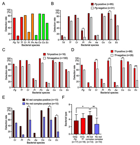 Distribution of periodontopathic bacterial species in dental plaque specimens. (A) Detection rates of each periodontopathic bacterial species. (B–E) Distribution of each periodontopathic bacterial species in (B) Porphyromonas gingivalis-positive and P. gingivalis-negative subjects, (C) Treponema denticola-positive and T. denticola-negative subjects, (D) Tannerella forsythia-positive and T. forsythia-negative subjects, (E) all red complex-positive and no red complex-positive subjects. (F) Bacterial type of periodontopathic bacterial species other than red complex. * p < 0.05, ** p < 0.01, *** p < 0.001 between each group. Pg, P. gingivalis; Td, T. denticola; Tf, T. forsythia; Cr, Campylobacter rectus; Pi, Prevotella intermedia; Pn, Prevotella nigrescens; Aa, Aggregatibacter actinomycetemcomitans; Co, Capnocytophaga ochracea; Cs, Capnocytophaga sputigena; and Ec, Eikenella corrodens.