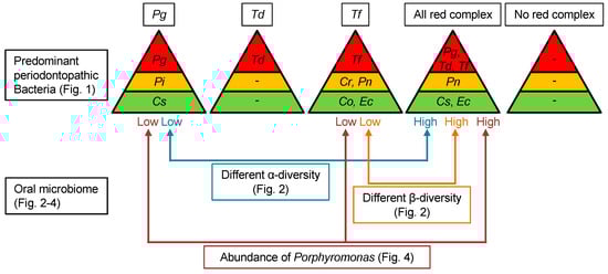 A schematic diagram of this study is shown in Figure 5. The abundance of orange complex and green complex species in dental plaque varied depending on the presence or absence of red complex species; Pg-positive and Tf-positive subjects showed predominant coexistence of specific orange complex and green complex species, respectively, but such coexistence with orange and green complex species was not prevalent in Td-positive and no red complex-positive subjects. All red complex positive-subjects had higher α-diversity than only Pg-positive subjects and higher β-diversity than only Tf-positive subjects. Furthermore, all red complex-positive subjects had a higher abundance of the Porphyromonas genus than Pg-positive and Tf-positive subjects. These results suggest that the composition of oral bacteria including periodontopathic bacteria varies significantly depending on the distribution of each red complex species in the oral cavity.