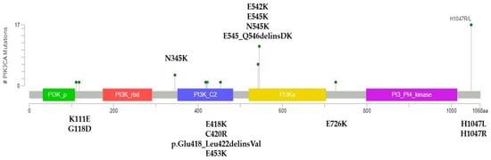 Lollipop plots allow the visualization of variants in a linear chart of the protein. We accessed the MutationMapper tool (University of Oxford, Oxford, UK) in cBioPortal [43,44]. Mutation data were input using protein nomenclature. A graphic was generated including the distribution and quantity of mutations in the PIK3CA protein.
