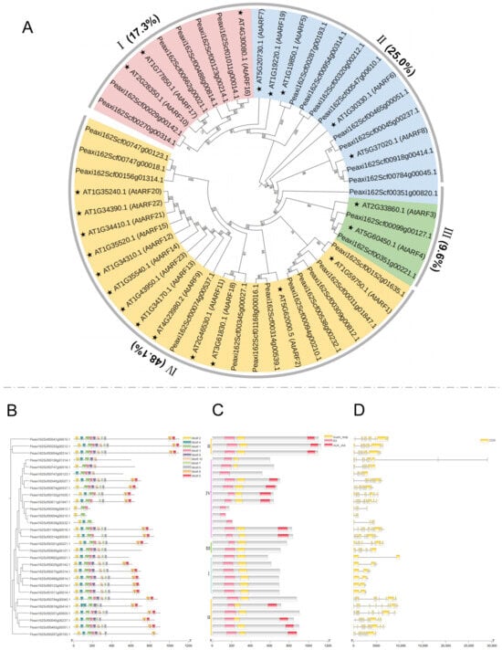 To elucidate the phylogenetic relationship of the ARF gene family in P. hybrida, an unrooted phylogenetic tree was constructed using multiple sequence alignment of ARFs from P. hybrida in conjunction with 23 ARF proteins from Arabidopsis (Figure 1). A total of 52 ARFs was grouped into four major clades: Clade I (six Arabidopsis and three Petunia ARF proteins), clade II (five Arabidopsis and eight Petunia ARF proteins), clade III (two Arabidopsis and three Petunia ARF proteins), and cladeIV (thirteen Arabidopsis and twelve Petunia ARF proteins), which was the largest clade, accounting for 48.1% (Figure 1A) []. Utilizing MEME tools, the distribution and structural diversity of conserved motifs among PhARF proteins, which are pivotal for the activation or inhibition of downstream genes through promoter binding, were explored, leading to the exclusion of two PhARFs, Peaxi162Scf00538g00231.1 and Peaxi162Scf00538g00223.1, due to the absence of conserved motifs (Figure 1B) []. Ten conserved motifs, each composed of distinct sequences, were identified in 29 ARF proteins of petunia (Figure S1). Of these, 11 PhARFs, distributed across different clades, contained all 10 motifs simultaneously (Figure S1). While the other PhARFs did not contain all 10 motifs, the arrangement and composition of the motifs were similar within the same clades (Figure 1B).
