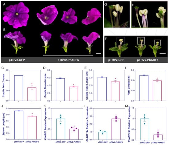 Phenotypic and molecular effects of PhARF5 silencing on petunia flower development. (A,B) Representative images of petunia flowers following VIGS-mediated silencing of PhARF5 compared to pTRV2-GFP controls. Frontal view showing significant reductions in petal number and corolla size in PhARF5-silenced flowers (A); side view highlighting the impact on corolla tube length and overall flower structure (B). Scale bars represent 1 cm. (C–E) Quantitative measurements of corolla traits of petal counts (C), diameter (D), and tube length (E) in PhARF5-silenced petunias compared to controls. (F–H) Effects of PhARF5 silencing on reproductive organ development. Whole flower view (F) with scale bars represent 1 cm; close-up views of stamens and pistils from control (G) and PhARF5-silenced (H) flowers with scale bars represent 1 mm. (I,J) Quantitative measurements of pistil (I) and stamen (J) lengths in PhARF5-silenced petunias compared to controls. (K–M) Relative expression levels of PhARF5 (K), PhARF19a (L), and PhARF19b (M) in PhARF5-silenced petunias compared to controls, determined by qPCR. The green dot and purple square represent the expression levels of each biological replicate. Data are presented as mean ± SE; * p < 0.05.
