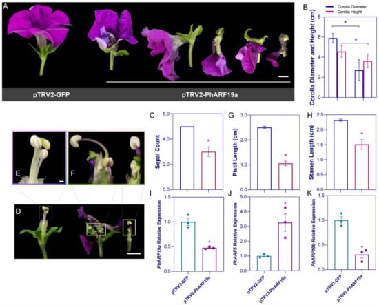 Phenotypic and molecular effects of PhARF19a silencing on petunia flower development. (A) Representative images of petunia corollas following VIGS-mediated silencing of PhARF19a compared to pTRV2-GFP controls. Scale bars represent 1 cm. (B,C) Quantitative measurements of corolla diameter and height (B), sepal count (C), in PhARF19a-silenced petunias compared to controls. (D–F) Effects of PhARF19a silencing on reproductive organ development. Whole flower view with scale bars represent 1 cm. (D). Close-up views of stamens and pistils from control (E) and PhARF19a-silenced flowers (F) with scale bars represent 1 mm. (G,H) Quantitative measurements of pistil (G) and stamen (H) lengths in PhARF19a-silenced petunias compared to controls. (I–K) Relative expression levels of PhARF19a (I), PhARF5 (J), and PhARF19b (K) in PhARF19a-silenced petunias compared to controls, determined by qPCR. The green dot and purple square represent the expression levels of each biological replicate. Data are presented as mean ± SE; * p < 0.05.