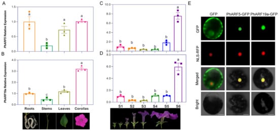 Expression patterns and subcellular localization of PhARF5 and PhARF19a in petunia. (A,B) Relative expression levels of PhARF5 (A) and PhARF19a (B) in various petunia organs, including roots, stems, leaves, and corollas, measured by qPCR. The different symbols in the figure represent the expression levels of each biological replicate for different tissues. (C,D) Expression patterns of PhARF5 (C) and PhARF19a (D) during different stages of flower development (S1–S6). The different symbols in the figure represent the expression levels of each biological replicate for different stages of flower development. (E) Subcellular localization of PhARF5-GFP and PhARF19a-GFP fusion proteins in petunia protoplasts. GFP signals indicate localization, NLS-RFP serves as a nuclear marker, and merged images confirm nuclear localization of both PhARF5 and PhARF19a. Bright-field images provide cell morphology. Scale bars represent 10 µm. Different letters indicate statistically significant differences (p < 0.05).