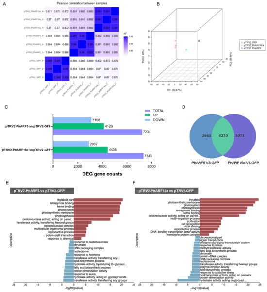 Transcriptome analyses of PhARF5- and PhARF19a-silenced petunias. (A) Pearson correlation heatmap between replicates of pTRV2-GFP (control), pTRV2-PhARF5, and pTRV2-PhARF19a samples. (B) Principal component analysis (PCA) of RNA-Seq data from control, PhARF5-silenced, and PhARF19a-silenced petunias. (C) Bar chart of differentially expressed genes (DEGs) in PhARF5-silenced and PhARF19a-silenced petunias compared to the control. (D) Venn diagram showing the overlap of DEGs between pTRV2-PhARF5 vs. pTRV2-GFP and pTRV2-PhARF19a vs. pTRV2-GFP. (E,F) Gene Ontology (GO) enrichment analyses of upregulated (red) and downregulated (blue) DEGs in PhARF5-silenced (E) and PhARF19a-silenced (F) petunias compared to controls.