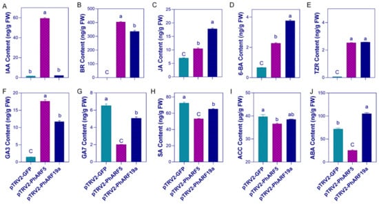 Phytohormone content analyses in PhARF5- and PhARF19a-silenced petunias. (A–J) Quantification of phytohormone levels of indole-3-acetic acid (IAA) (A); brassinosteroid (BR) (B); jasmonic acid (JA) (C); 6-Benzylaminopurine (6-BA) (D); Trans-Zeatin-riboside (TZR) (E); gibberellin 3 (GA3) (F); gibberellin 7 (GA7) (G); salicylic acid (SA) (H); 1-Aminocyclopropane-1-carboxylic acid (ACC) (I); abscisic acid (ABA) (J), in controls, PhARF5, and PhARF19a-silenced petunias using UPLC-MS/MS. Different letters indicate statistically significant differences (p < 0.05).