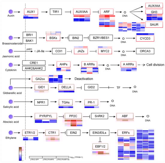 Differential expression of hormone signaling pathway genes in PhARF5- and PhARF19a-silenced petunias. Heatmap representation of differentially expressed genes (DEGs) in various hormone signaling pathways of auxin, brassinosteroid, jasmonic acid, cytokinin, gibberellic acid, salicylic acid, abscisic acid, ethylene in pTRV2-GFP (control), pTRV2-PhARF5, and pTRV2-PhARF19a-silenced petunias. Auxin signaling pathway: AUX1 (Auxin Resistant 1), TIR1 (Transport Inhibitor Response 1), AUX/IAA (Auxin/Indole-3-Acetic Acid), ARF (auxin response factor), GH3 (Gretchen Hagen 3), and SAUR (Small Auxin-Up RNA); Brassinosteroid signaling pathway: BRI1 (Brassinosteroid Insensitive 1), BAK1 (BRI1-Associated Receptor Kinase 1), BSKs (Brassinosteroid-Signaling Kinases), BIN2 (Brassinosteroid Insensitive 2), BZR1/BES1 (Brassinazole Resistant 1/BRI1-EMS-Suppressor 1), CYCD3 (Cyclin D3); Jasmonic Acid Signaling Pathway: COI1 (Coronatine Insensitive 1), JAZs (Jasmonate ZIM-Domain Proteins), and MYC2 (Myelocytomatosis 2); Cytokinin Signaling Pathway: CRE1 (Cytokinin Response 1), AHK2 and AHK3 (Histidine Kinase 2 and 3), AHPs (Histidine-Containing Phosphotransfer Proteins), B-ARRs (Type-B Response Regulators), and A-ARRs (Type-A Response Regulators); Gibberellic Acid Signaling Pathway: GA2ox (Gibberellin 2-Oxidase), GID1 (Gibberellin Insensitive Dwarf 1), DELLA (DELLA Protein), and GID2 (Gibberellin Insensitive Dwarf 2); Salicylic Acid Signaling Pathway: NPR1 (Nonexpresser of Pathogenesis-Related Genes 1), TGAs (TGA Transcription Factors), and PR-1 (Pathogenesis-Related Protein 1); Abscisic Acid Signaling Pathway: PYR/PYL (Pyrabactin Resistance/Pyrabactin Resistance-Like), PP2C (Protein Phosphatase 2C), SnRK2 (Snf1-Related Protein Kinase 2), and ABF (Abscisic Acid-Responsive Element-Binding Factor); Ethylene Signaling Pathway: ETR1/2 (Ethylene Receptor 1/2), CTR1 (Constitutive Triple Response 1), EIN2 (Ethylene Insensitive 2), EIN3/EILs (Ethylene Insensitive 3/Ethylene Insensitive-Like), ERFs (Ethylene Response Factors), and EBF1/2 (EIN3-Binding F-Box 1/2).