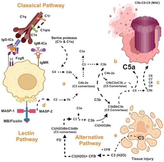 The alternative pathway of complement activation is constitutively active at a basal level and amplifies upon the detection of pathogens or injured tissues. It begins with the spontaneous hydrolysis of C3, producing C3 (H2O), which then binds complement factor B (CFB). Factor D (FD) cleaves factor B to produce C3 (H2O)Bb, functioning as a C3 convertase, as shown in Figure 1e. This C3 convertase then follows a pathway similar to that of the classical pathways, cleaving C3 into C3a and C3b. C3b binds to C3 (H2O)Bb to form the C5 convertase (C3bBb), which subsequently cleaves C5 into C5a and C5b. This initiates the assembly of the MAC, comprising C6, C7, C8, and multiple C9 molecules. The MAC forms a transmembrane channel in both microbial and host cell membranes, leading to cell lysis and the destruction of targeted microorganisms or damaged host cells, as illustrated in Figure 1a–c.