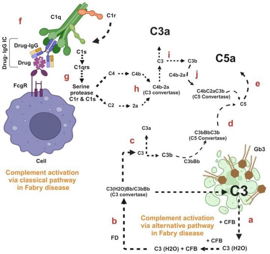 However, post enzyme replacement therapy can lead to the formation of drug, i.e., agalsidase α- or agalsidase β-specific IgG antibodies (Drug-IgG), which bind to the indicated therapeutic drugs and forms the drug-specific IgG immune complexes (Drug-IgG ICs) (Figure 2f). The subsequent binding of C1qc to Drug-IgG ICs activates serine proteases C1r and C1s (Figure 2g). This activation triggers the cleavage of C4 and C2, ultimately forming C3 convertase (C4b2a) through the classical complement pathway (Figure 2h). The resulting C3 convertase (C4b2a), from classical pathways facilitates the downstream cleavage of C3 into C3a and C3b (Figure 2i). The interaction of C3 convertase with C3b subsequently leads to the formation of C5 convertase, which cleaves C5 into C5a in the context of Fabry disease (Figure 2j).