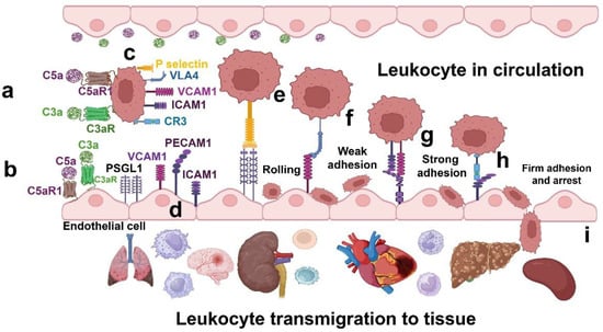 The activation of C3aR by C3a and C5aR by C5a leads to the upregulation of key adhesion molecules, including complement receptor 3 (CR3), vascular cell adhesion molecule 1 (VCAM1), intercellular adhesion molecule 1 (ICAM1), and platelet and endothelial cell adhesion molecule 1 (PECAM1) on leukocytes and endothelial cells that cause excess tissue recruitment of macrophages, T cells, and B cells [,,,,]. Such C3a–C3aR and C5a–C5aR axes mediated enhanced tissue recruitment of innate and adaptive immune cells contributes to progressive tissue damage in various conditions, including lung injuries, fibrosis, renal failure, cardiomegaly, stroke, and neurodegenerative diseases [,,,,,,,].