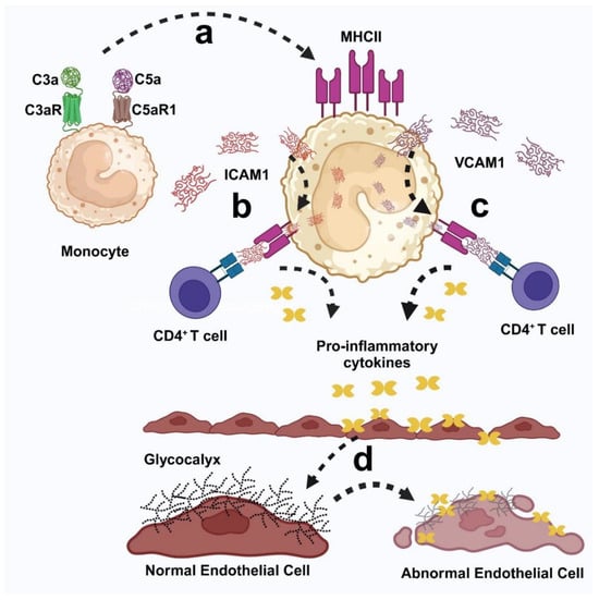 Furthermore, C3a deficiency or blockade with C3a receptor antagonists (C3aRA) showed marked reduction in the endothelial expression of VCAM1 and leukocyte (e.g., CD8+ T cells) infiltration in models of cerebral inflammation []. A C3aRA-treated mouse model of middle cerebral artery occlusion showed lower expression of ICAM1 on endothelial cells, decreased neutrophil infiltration in the ischemic zone, and smaller stroke volumes compared to vehicle-treated controls, suggesting that targeting C3aR effectively modulates stroke-related injury in ischemia/reperfusion scenarios []. The stimulation of human umbilical vein endothelial cells with C5a revealed that it induces an upregulation of ICAM1 and VCAM1 []. An increased expression of ICAM1 induced by C5a has been observed in choroidal endothelial cells []. Additionally, anti-C5a treatment suppressed ICAM1 upregulation, neutrophil infiltration, lung vascular permeability, and injury in IgG immune complex-induced lung injury models [].
