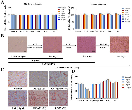 As shown in Figure 1A, after treatment with different concentrations of ginsenosides (1, 5, 10, 25, 50, 100 μM) on 3T3-L1 adipocyte precursor cells, it was found that ginsenosides PPT, 20 (s)-Rg3, PDQ, Rh1, and Rf had no significant effect on the viability of 3T3-L1 adipocyte precursor cells. As shown in Figure 1B, after treatment with different concentrations of ginsenosides on 3T3-L1 mature adipocytes, it was found to have no significant effect on the viability of 3T3-L1 mature adipocytes. From this, it can be concluded that ginsenosides have no significant cytotoxic effect on 3T3-L1 adipocyte precursor cells (undifferentiated cells) and mature adipocytes (differentiated cells) within the concentration range of 0–100 µM. Subsequent induction differentiation experiments were performed using this concentration.