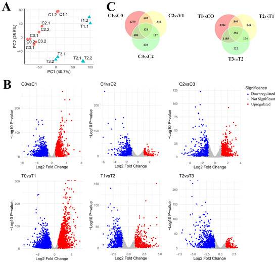 Based on the previous cell viability assay, we selected these different ginsenosides to act on the entire process of differentiation of 3T3-L1 preadipocytes. Once differentiation was complete, Oil Red O staining was used to detect the effect of ginsenosides on adipocyte differentiation. As shown in Figure 1C, after the control group cells were cultured in an environment containing a differentiation medium for eight days, a solid staining area was shown, indicating that the preadipocytes had differentiated into mature adipocytes containing many lipid droplets. However, with the addition of different ginsenosides, the results showed that only in the PPT treatment group was the Oil Red O staining area in the adipocytes significantly reduced, indicating that PPT can inhibit the formation of lipid droplets and thus inhibit the differentiation of 3T3-L1 preadipocytes. Obesity is characterized by increased size (hypertrophy) and number (hyperplasia) of adipocytes, resulting in increased adipose tissue mass. This is caused by the hypertrophy of adipocytes and the differentiation of preadipocytes into mature adipocytes. We measured lipid accumulation in adipocytes after eight days of differentiation to evaluate the inhibitory effects of different ginsenosides on adipocyte differentiation. As shown in Figure 1D, within the 25–100 μM dosage range, most ginsenosides did not show significant inhibitory effects compared to the control group. However, PPT significantly reduced lipid accumulation in 3T3-L1 adipocytes at all concentrations, effectively inhibiting adipocyte differentiation. In particular, at a concentration of 100 μM, lipid accumulation in the PPT-treated group was only 50.8% of that in the control group. This indicates that PPT significantly inhibited the accumulation of lipid droplets in 3T3-L1 cells, effectively suppressing the differentiation of preadipocytes into mature adipocytes. We chose PPT as the subject of our research to further investigate its mechanism of action at different stages of preadipocyte differentiation. We designated the preadipocytes as group C0, the three stages of the control group as C1, C2, and C3, and the three stages of the PPT treatment group as T1, T2, and T3. We collected RNA from each of these seven groups for subsequent transcriptomic analysis.