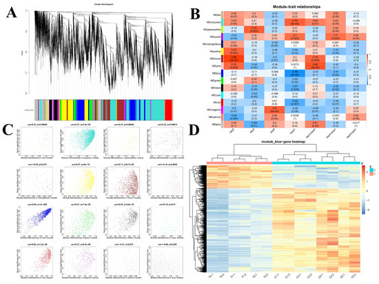 WGCNA. (A) The partitioning of gene modules. This figure illustrates the clustering of genes, and the division of gene modules is based on this result. The branches of the same color were assigned to the same gene module. (B) Associations between modules and traits. Panel A illustrates the correlation between gene module and sample information, with the x-axis representing sample information and the y-axis representing each gene module. The color intensity indicates the strength of the correlation, with red representing a positive correlation and blue representing a negative correlation. The p-value, which represents the significance value, is provided in brackets. (C) Scatterplots of gene significance (GS) (y-axis) versus module membership (MM) (x-axis) for sixteen modules. This figure illustrates the degree of significance attributed to the genes within the sixteen modules. (D) The clustering heatmap demonstrates the expression of 838 genes within the blue module.