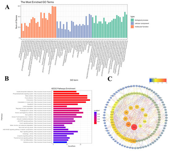 GO and KEGG functional enrichment analyses of differentially expressed genes in the blue module. (A) The comparison of GO enrichment. It shows the top 20 significantly enriched GO terms, including biological process, cellular component, and molecular function. (B) KEGG pathway enrichment. It shows the top 20 significantly enriched KEGG pathways. (C) Protein–protein interaction network of blue module genes. The edge represents interactions between genes. A degree describes the importance of the protein nodes in the network. The top 10 genes with the highest degree values were found using CytoHubba_MCC, and the depth of the color corresponded to the weighted score.