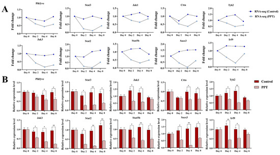By analyzing the gene network in the blue module, we identified the top ten core genes with the highest scores in the PPI network, including PIKfyve, STAT3, JAK1, CTTN, TYK2, JAK3, STAT2, STAT5b, SOCS3, and IRF9. Of these, STAT3, JAK1, TYK2, JAK3, STAT2, STAT5b, SOCS3, and IRF9 were found to be significantly enriched in the JAK-STAT signaling pathway. As illustrated in Figure 5A, the expression levels of these genes in the PPT treatment group exhibited a downward trend relative to the control group as the differentiation days of the preadipocytes increased. The expression pattern of these differentially expressed genes provides further evidence to support the hypothesis that PPT inhibits preadipocyte differentiation by negatively regulating these genes. These core genes involve several critical biological processes, including lipid metabolism, cell proliferation, and differentiation regulation. The three nodes with the highest number of connections are PIKfyve, STAT3, and JAK1, which suggests that PPT’s inhibition of 3T3-L1 preadipocyte differentiation may be primarily related to inositol phosphate metabolism and the JAK-STAT signaling pathway [19]. Subsequently, we conducted RT-qPCR to validate the expression levels of the genes mentioned above, thereby verifying the differential expression observed in the RNA-Seq analysis.